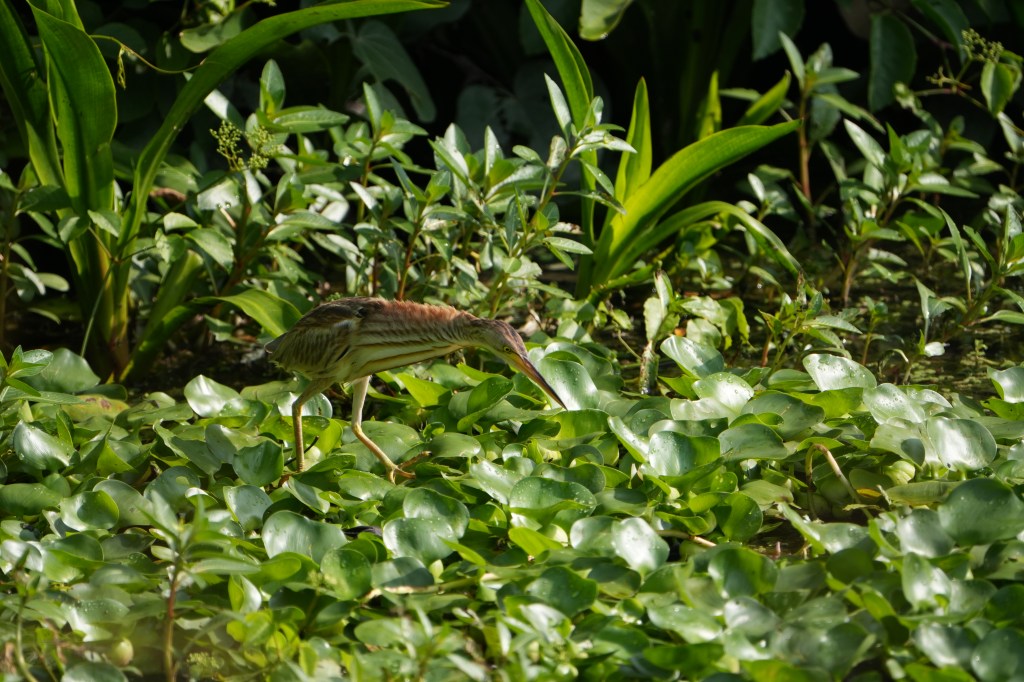🐦 A lone Yellow Bittern was spotted hunting for food. It stood patiently atop a bed of Common Water Hyacinth, treading carefully and remaining still for some time. The bird extended its neck several times, possibly assessing its distance between the prey and water depth, before attempting a strike. However, it was unsuccessful.